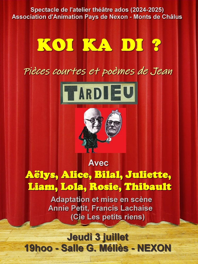 Atelier théâtre Ados animé par Annie Petit et Francis Lachaise (Cie Les petits riens) pour l’Association d’Animation Pays de Nexon-Monts de Châlus (87).